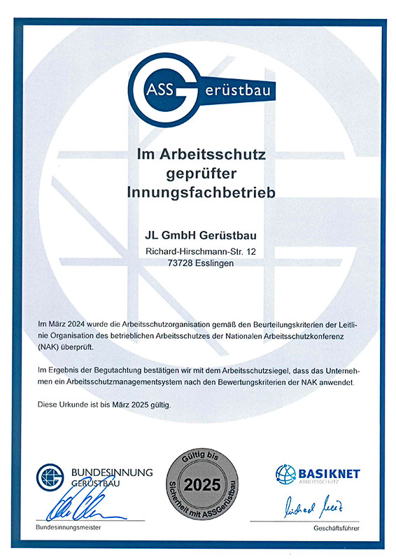 Zertifikat: ASS Gerüstbau, Im Arbeitsschutz geprüfter Innungsfachbetrieb